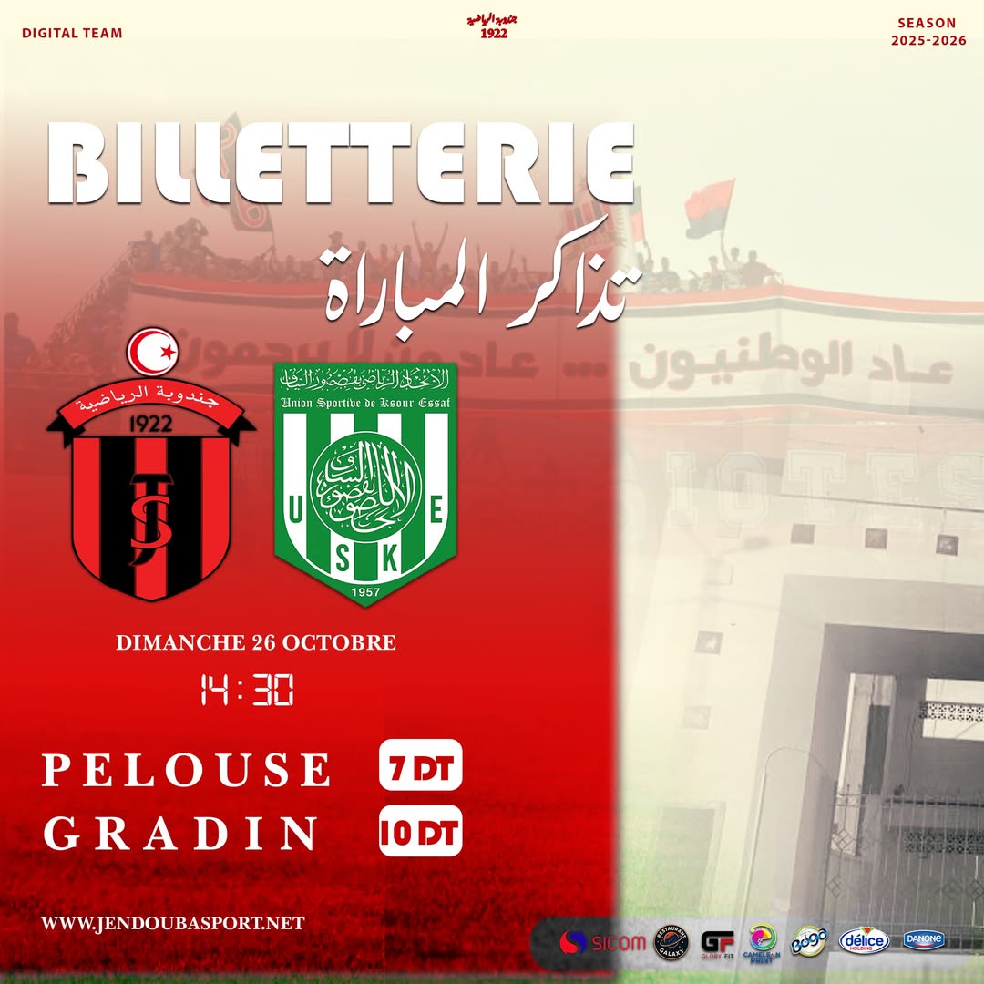 انطلاق بيع التذاكر لمقابلة جندوبة الرياضية ضد الاتحاد الرياضي بقصور الساف الملعب البلدي معز الطويهري – جندوبة الأحد 26 أكتوبر 2025 الساعة 14:30 الرابطة المحترفة الثانية 2025 / 2026 – الجولة السادسة نقاط البيع المعتمدة: Apostrophe Librairie (Majdi Bouslimi) – جندوبة الشمالية Café Podium Café Oasis Café Yasmine (Hafnaoui) فتحي خضار (المارشي) رياض المعروفي (boutique...Read More