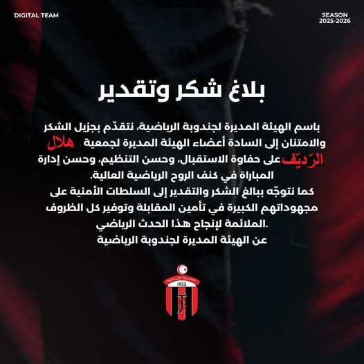 بلاغ شكر وتقدير إلى الهلال الرياضي بالرديف والسلطات الأمنية على حسن التنظيم وحفاوة الاستقبال