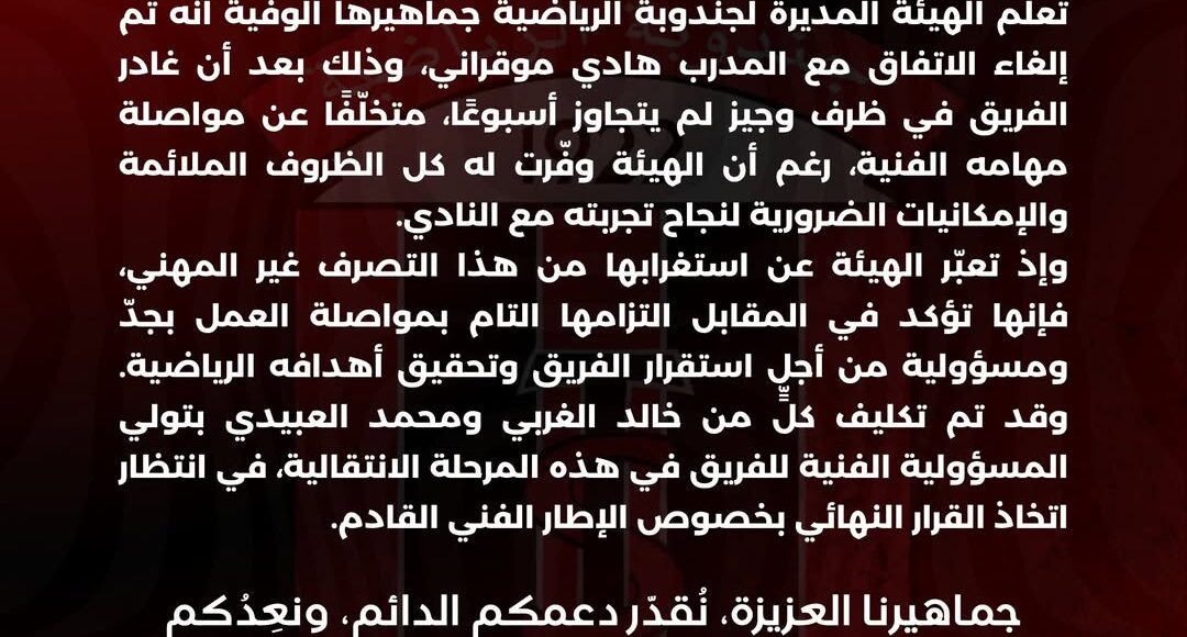 بلاغ الهيئة المديرة لجندوبة الرياضية تعلم الهيئة المديرة لجندوبة الرياضية جماهيرها الوفية أنه تم إلغاء الاتفاق مع المدرب هادي موقراني، وذلك بعد أن غادر الفريق في ظرف وجيز لم يتجاوز أسبوعًا، متخلّفًا عن مواصلة مهامه الفنية، رغم أن الهيئة وفّرت له كل الظروف الملائمة والإمكانيات الضرورية لنجاح تجربته مع النادي. وإذ تعبّر الهيئة عن استغرابها من...Read More